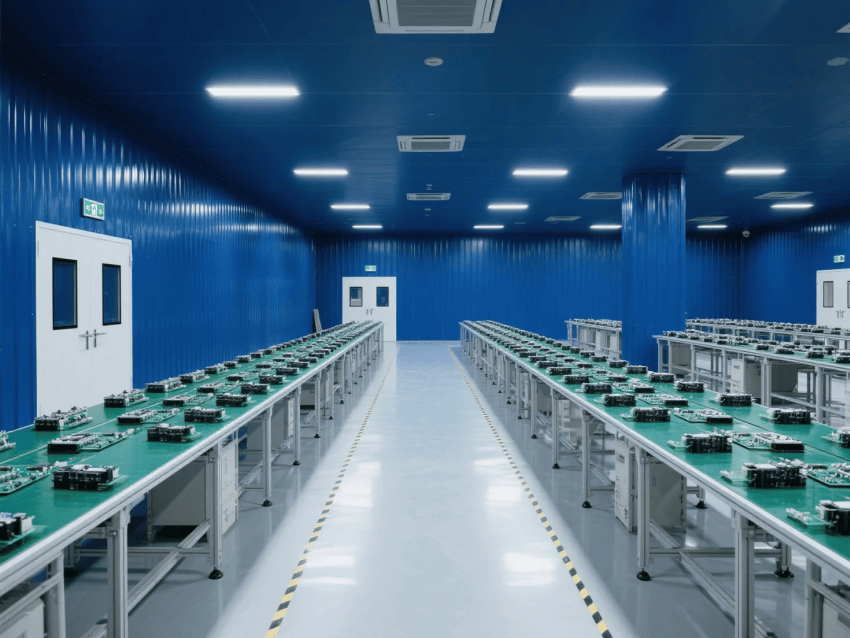 本工程嚴格遵循ISO14644-1Class8標準,采用"工業(yè)科技風"設(shè)計理念,打造現(xiàn)代化電子零件制造環(huán)境。車間以深藍彩鋼板墻體與淺灰防靜電環(huán)氧地坪形成鮮明視覺對比,營造兼具科技感與功能性的生產(chǎn)空間。